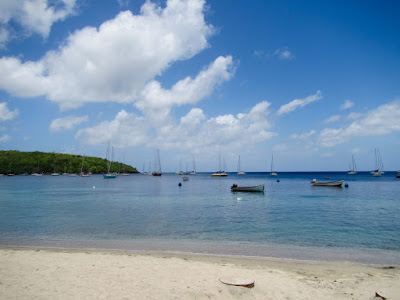 Diamond Rock and into the anchorage at Ste-Anne. Little did we know this wouldn't be our only visit here, but for now it seemed like the perfect anchorage: well protected, calm, big enough to accommodate hundreds of boats, a nice beach, and a boulangerie a few minutes from the dock. It was the perfect spot to rest up and celebrate - Martinique is considered the "top of the hill" in terms of sailing upwind into the trade winds in the Caribbean. At 60 degrees 53 minutes 07 seconds West, we would not be going any further east. From here on, we could coast with the wind to the side or behind us, a much more comfortable ride.